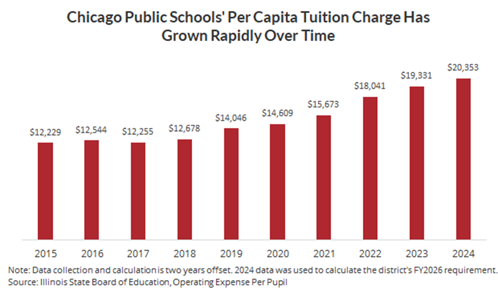 State law defines the minimum funding for each charter school through a formula known as the Per Capita Tuition Charge (PCTC). Originally defined to determine the tuition rate a school district should charge to a nonresident student, PCTC is calculated by totaling operational and debt spending for a school district, subtracting funding received from state or federal sources, and dividing by the district’s average attendance rate. In FY2026, CPS’ PCTC was calculated to be $20,352.85.