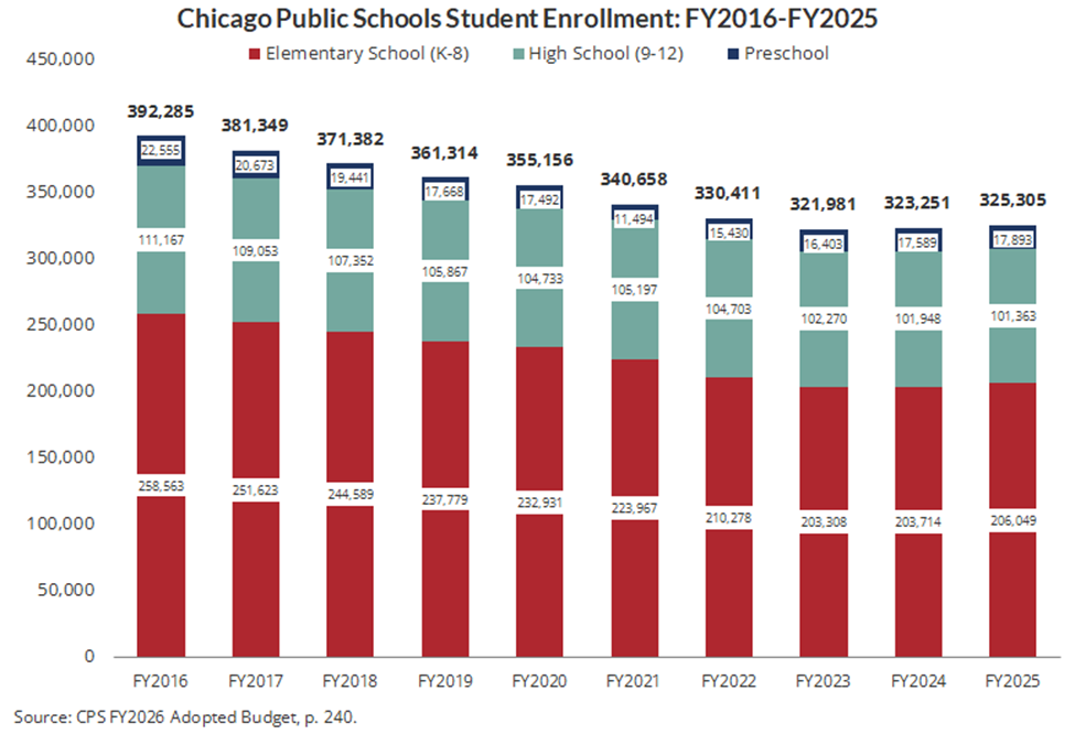 The CPS student population as a whole has faced consistent enrollment decline for decades, losing almost 60,000 students in the past decade. Enrollment was over 390,000 students in FY2016, while in FY2025 it was just above 325,000—an approximately 17% decrease.