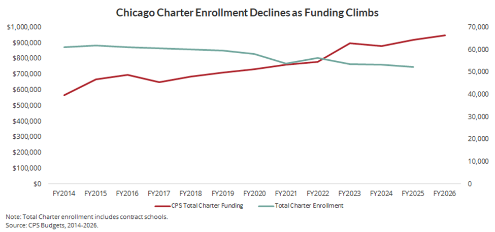 The Chicago Public School District (CPS or the ‘District’) has 108 charter schools, which in 2025 accounted for an enrollment of 50,326 students. The total 2025 enrollment for CPS was 325,305 students, approximately 16.1% of whom were enrolled in charters. In its 2026 fiscal year, CPS will directly spend approximately $948 million on funding charter and contract schools, almost a tenth of the total CPS budget and over 17.5% of all direct school funding.