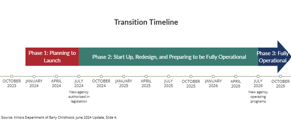 Maintaining service continuity: The transition is structured as a multi-year, phased rollout through July 2026, during which ISBE, IDHS, and DCFS will continue to administer programs. Ensuring uninterrupted service delivery for families while building new agency infrastructure presents a balancing act. Transition risk materials note that the needed capacity for integration and potential delays in federal approvals could add pressure.