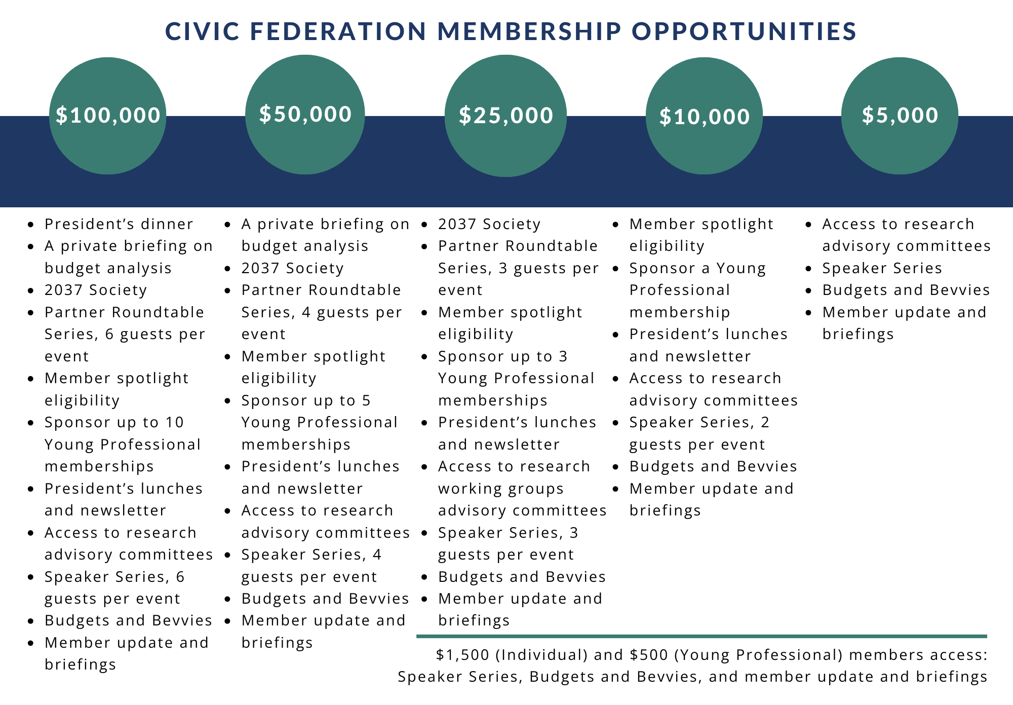 Membership includes access to a series of exclusive programs and events held throughout the year, connecting you directly with Civic Federation staff, public officials, subject-matter experts, and fellow leaders. These gatherings spark dynamic conversations, foster new partnerships, and turn bold ideas into actionable solutions for our region’s most pressing challenges. We offer several levels of membership, thoughtfully calibrated to organization type and size, individual needs, and the desired level of engagement and impact.