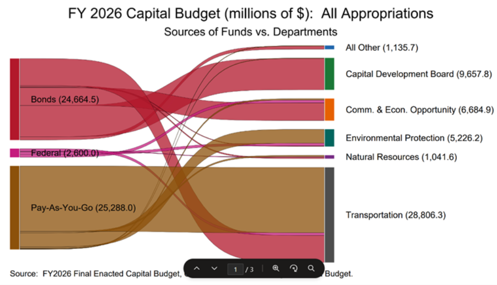 Since 2005, the capital budget has been produced as a separate document from the State’s operating budget and goes through a separate approval process through the state legislature. A Civic Federation review of the FY2026 State of Illinois enacted operating budget can be found here.
