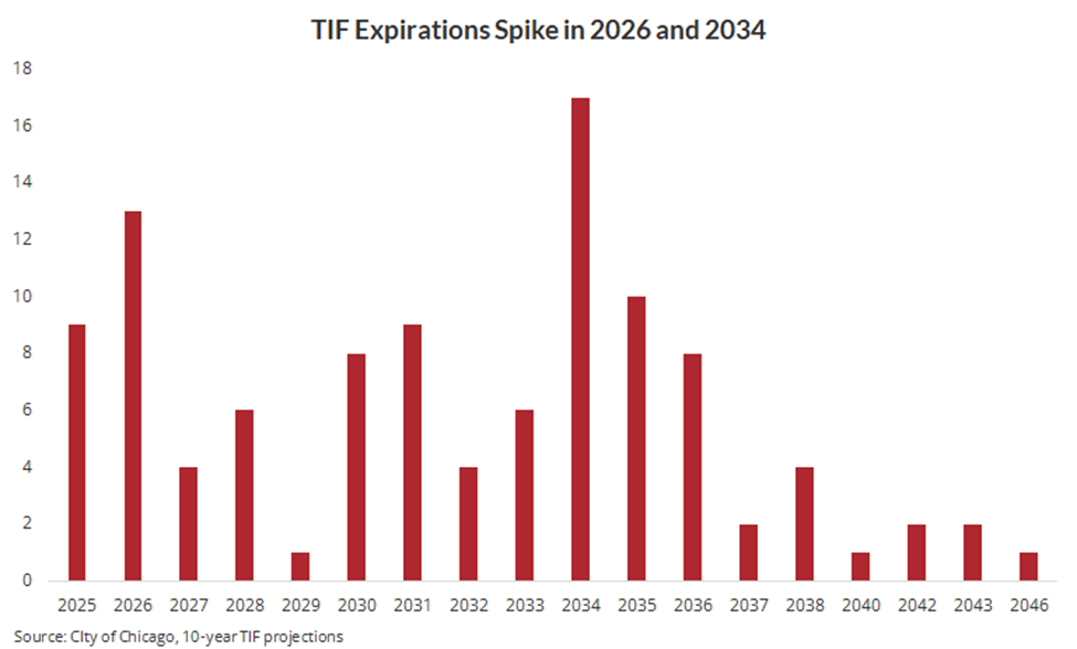 Although this year’s $1.01 billion surplus is the largest in Chicago’s history, the oncoming expiration of many TIFs beginning in 2030 means that surpluses will begin to decline. As more TIF districts expire, local governments will be unable to rely on TIF surpluses to provide revenue increases. The City and its sister agencies should beware of counting on TIF surplus revenue in future budgets – eventually, it will not be there.